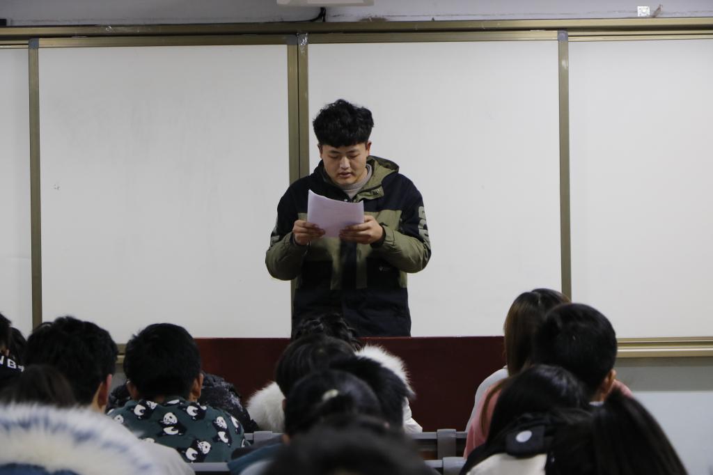 此次比赛分为三个环节:首先主持人介绍参加本次朗诵比赛的评委,随后宣读此次演讲比赛的规则,最后是选手上台朗诵。活动现场参赛选手们精神饱满、感情充沛、表达流畅,他们富有感染力的朗诵打动了参赛评委和其他选手,现场掌声不断。其中装备202班李庆福选手凭借他独特的嗓音和发自内心的言语打动了所有在场人员,将现场氛围推向了高潮;朗诵环节结束后,评委根据选手的表现给出了相应的分数,比赛结束后社会实践部统计选手们的最终成绩并由主持人公布获奖选手。