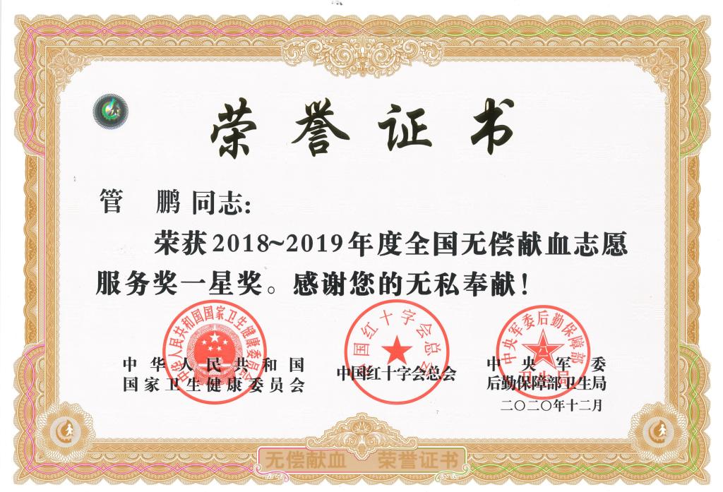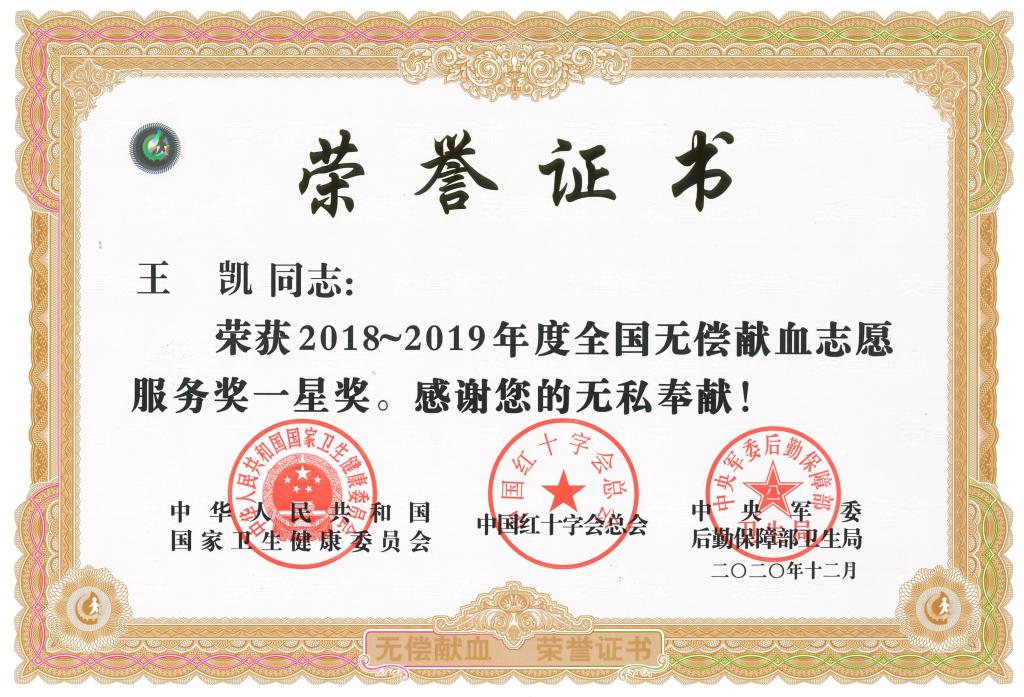 近日,国家卫生健康委员会、中国红十字会总会、中央军委后勤保障部卫生局联合组织召开2018-2019年度全国无偿献血表彰电视电话会议,会议表彰了无偿献血先进集体和个人。公司王凯、李勇、管鹏三名同学荣获2018-2019年度全国无偿献血志愿服务一星奖。
