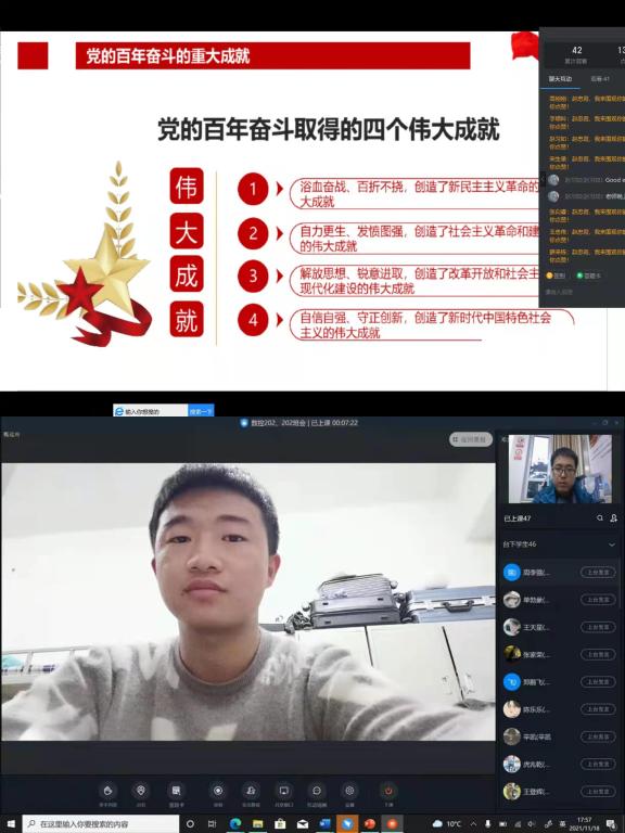 因疫情防控工作要求,本次主题班会以钉钉线上平台为依托。班会期间,在辅导员、班主任的带领下,员工干部、各班级成员首先观看十九届六中全会转播,学习会议文件;随后以参与小组讨论、员工干部、班级员工代表线上发言等多种形式,对习近平总书记在党的十九届六中全会上的重要讲话和中国共产党十九届中央委员会第六次全体会议公报进行学习讨论,并结合“最美白衣天使”、“疫情中的逆行者”、“少年强则国强”等主题,热烈讨论了兰州疫情期间同学们的所见所感,在班级和宿舍中掀起了一股学习贯彻党的十九届六中全会精神的热潮。