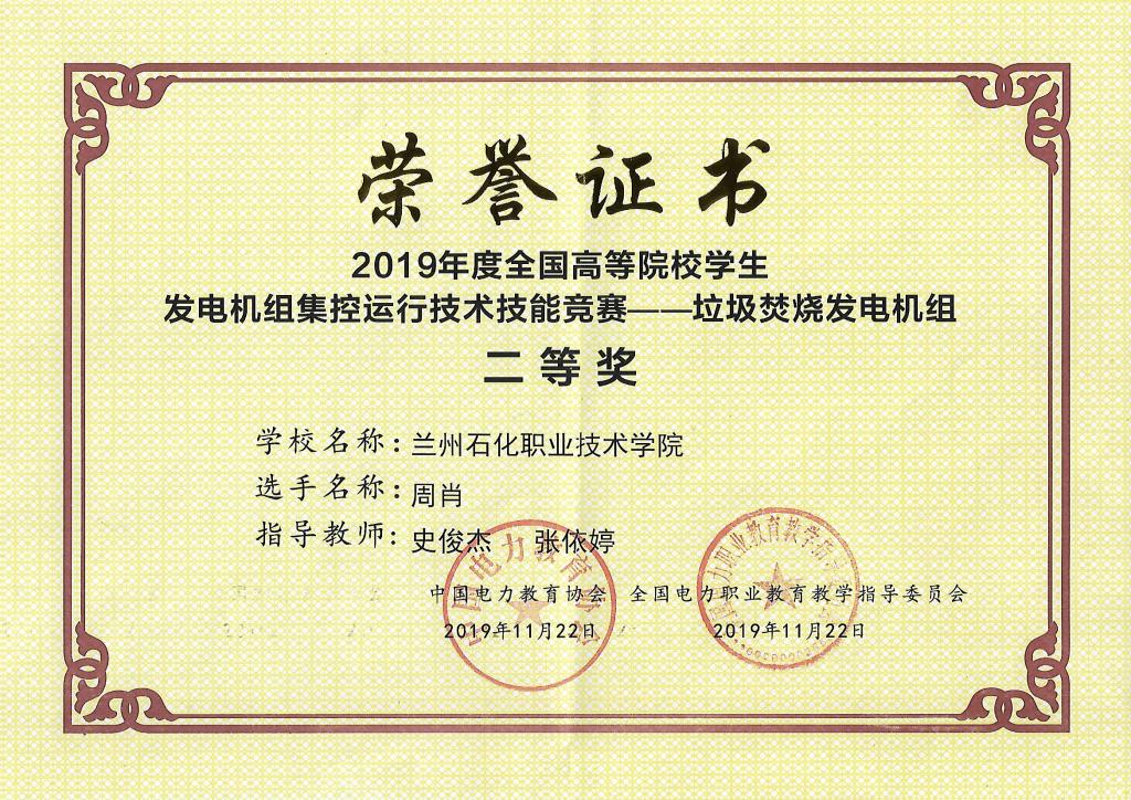2019年度全国高等院校员工发电机组集控运行技术技能竞赛—二等奖