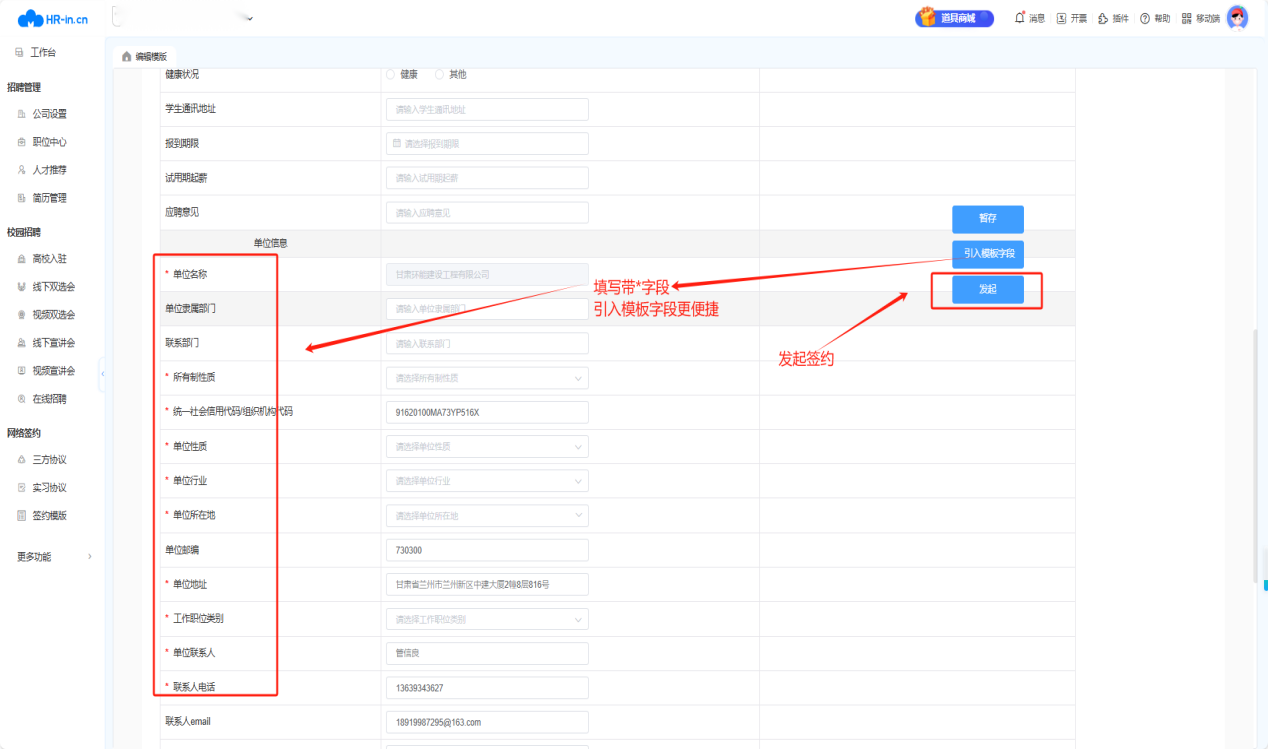 6.网签三方协议。进入“网络签约—三方协议”管理页面,切换入驻的公司和毕业年份,搜索目标员工,按要求填写完整相关信息,点击“发起”即可对该生发起邀约申请。如未找到目标员工,请线下联系就业负责人。